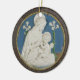 Una reproducción plana de "La Virgen de los Lirios", un hermoso bajorrelieve renacentista de la Madonna y el Niño Jesús del taller de Della Robbia. La Virgen María, vista de perfil, mira tiernamente a su bebé Jesús, que se sienta en su regazo. A sus lados hay dos lirios blancos. Los personajes y las flores de lirio son blancos, el fondo es azul. Están rodeados por un marco de patrón de escamas (o concha de peregrino) marrón.