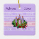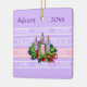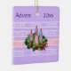 Delante: ilustracion de una corona advenediza hecha de verduras y hueca con las cuatro velas encendidas sobre un fondo de rayas horizontales. Las franjas horizontales están bordeadas de blanco y, leyendo de arriba a abajo, contienen las palabras esperanza, paz, alegría y amor en letras blancas mayúsculas. Las palabras personifican los temas de las cuatro semanas de Advent. El fondo es en su mayor parte violeta (púrpura claro o lila), excepto por la franja detrás de la palabra alegría, que es rosa en consonancia con el color litúrgico del Tercer Domingo de Advenimiento, conocido como Domingo de Gaudete. + Atrás: Un deseo estacional que incorpora los temas de las cuatro semanas de Advenimiento: esperanza, paz, alegría y amor. + Créditos de la Imagen: Black and white Advent wreath generados por imicoloringdesign a través de Pixabay, modificado y coloreado por Saints_Aabundy; bow by Elionas también vía Pixabay.