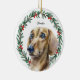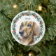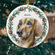 Celebra tu Dachshund esta temporada navideña con un encantador retrato acuático enmarcado en una flor de vegetación festiva con bayas rojas. Personalice el diseño con el nombre y el año de su cachorro en un tipo de letra de guión clásico para un mantenimiento realmente especial. Perfecto para las familias de los perros salchichas y los amantes del doxie, este adorno trae alegría de unas vacaciones intemporales y hace un regalo atento para cualquier padre mascota.