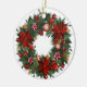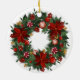 Un ilustracion de arte digital de un adorno navideño, con un diseño de corona. La corona está compuesta por ramas de pino verde, poinsettias rojas, bayas rojas, bayas doradas y caramelos rayados rojos y blancos. La decoración es redonda y blanca, con una cuerda dorada en la parte superior para colgar. El fondo es blanco. El estilo recuerda a las decoraciones navideñas clásicas, con un toque de arte digital moderno. La paleta de colores está dominada por rojos, verdes y dorados, lo que crea un ambiente festivo y acogedor.