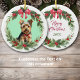 Este adorno de bonito Holiday cuenta con un hermoso retrato acuático de un adorable perro cachorro Yorkshire Terrier. El Yorkie está enmarcado con una corona hueca y bayas rojas, con un brillante arco rojo en la parte superior. El cachorro también lleva un arco rojo. La parte posterior del ornamento tiene la misma corona de arco rojo, con dos campos de texto para su personalizar.