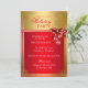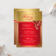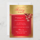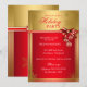 Invitación de fiesta de Navidad de oro rojo. Elegante cinta y adorno con copos de nieve dorados.
