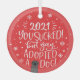 Moderno y adorable adorno navideño para los amantes del perro con una divertida leyenda con letras a mano que dice "¡2021 chupaste! ¡Pero sí, adopté a un perro!" con fuentes blancas sobre un fondo rojo festivo, y está decorado con copos de nieve y una adorable pata de perro gris.