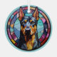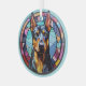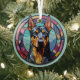 Aquí hay un adorno de cristal de bonito con una temática de vidrio teñido, con un hermoso perro Doberman Pinscher. El perro se coloca sobre un fondo de mosaico multicolor. Los colores incluyen el azul, el oro, el rojo marrón y el rosa lavanda. Esto hace que sea un buen obsequio de medias o decoración para la casa que ama a un majestuoso Doberman.