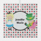 Cute Alicia en el país de las maravillas personalizado Navidades regalo de adorno de vidrio para un amante de los libros o bibliotecario que ama leer libros para niños. La niña pequeña Alice con su vestido azul y el sombrerero loco se sientan encima de un patrón de barajas en rojo y negro con espadas y símbolos de diamante. Personalizar con su propio texto.
