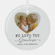 Ornamento de árboles de navidad personalizada con dos fotos familiares en forma de corazón lindo, las palabras "te queremos abuela" y los nombres de los nietos. ¡Se puede cambiar a cualquier relación!
