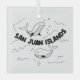 Simple diseño de caricatura con Gales, burbujas y olas y "Islas San Juan" escrito en negrita.