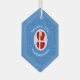 La decoración de Hanukkah con forma de hexágono de vidrio para la temporada de vacaciones muestra un ángel con la bandera roja y blanca de Dinamarca. Diseñado para familias de múltiples religiones, el ángel danés Hanukkah se encuentra en el centro de plazas blancas de calamar rodeadas de plazas azules de calamar. Añadir un nombre para personalizar. Personalizar añadiendo el año. O bien, agrega tu propio texto.