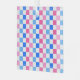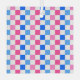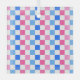 A checkerboard pattern of pink, blue, and white squares creates a vibrant and lively visual effect, conveying playfulness and energy.