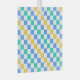 A colorful checkered pattern with alternating blue, green, and yellow squares on a white background. The design is vibrant and geometric, creating a playful tone.