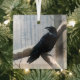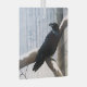Un cuervo negro sentado en una rama de árbol. Invierno y árboles alrededor con nieve.