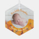 Este hermoso y moderno ornamento de fotos para recién nacidos del Día de Acción de Gracias muestra una fotografía de tu dulce recién nacido bajo las palabras Nuestra calabaza en naranja. Esta fotografía de otoño de bonito con madera blanca a la moda detrás del parche de calabazas es un elegante regalo de bizcocho para un nacimiento de Halloween o de Acción de Gracias.