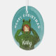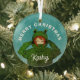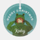 Chica lindo con ornamento de vidrio para Navidades de dibujos animados de rana verde. Un lindo dibujo de un chica con un carnero de rana verde y un nombre personalizado. Diversión, diseño vacacional con copos de nieve para un chica. Añade tu nombre y texto.