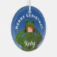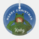 Chica lindo con ornamento de vidrio para Navidades de dibujos animados de rana verde. Un lindo dibujo de un chica con un carnero de rana verde y un nombre personalizado. Diversión, diseño vacacional con copos de nieve para un chica. Añade tu nombre y texto.