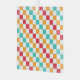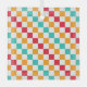 Alternating red, orange, teal, and white squares create a colorful, vibrant checkerboard pattern, conveying an energetic and playful tone.