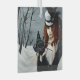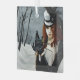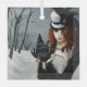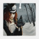 Victoria en Steampunk mujer de cabello rojo en una caminata de invierno para liberar a su mensajero de libélula con una llave