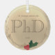 Un adorno navideño de vidrio para un doctorado con un esquema de color oro (no Relieve metalizado), y una decoración de bayas y hojas. Muestra el grado, nombre y año. Simplemente personalizar este ornamento, agréguelo a su carrito, y tenga un gran logro Holly Berry Gold PhD Graduación Nombre Glass Ornament Holiday Diseño | ©Melissa Patton - Diseñador