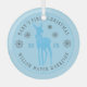 Moderno ornamento bebe polvoriento azul para la primera Navidad del bebé, personalizado con el nombre del bebé, año, ciervo con un arco, copos de nieve y letras curvadas en letra de serif.