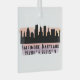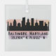 El ornamento de cristal presenta la silueta de la ciudad de Baltimore Maryland con salpicaduras de color de agua y coordenadas del mapa de latitud y longitud