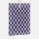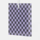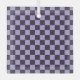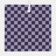 A vibrant checkered pattern with alternating black and lavender squares creates a bold, symmetrical grid. The design is balanced and visually striking.