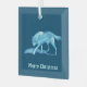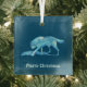 Un lobo azul estilizado (Canis lupus) proyecta una sombra a medida que pasa por un terreno nevado. También aparece un texto de personalizable que dice "Feliz Navidad".