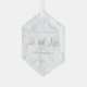 ¿Te casaste este año? Añade un recuerdo a tu árbol con este adorno de keepsake moderno y elegante con las palabras "Nuestra primera Navidad como Sr. y Sra." en un falso guión de oro rosa sobre un fondo de mármol gris y blanco. Utilice la plantilla para agregar sus nombres y el año de su boda. Este adorno también hace un gran regalo a una pareja recién casada para su primera Navidad.