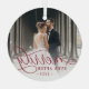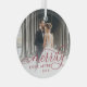 Elegante ornamento de fotos de vacaciones para recién casados presenta una foto boda favorita con "Merrily Ever After" colocado en el guión de caligrafía de moda. Personaliza con el año abajo.