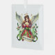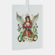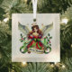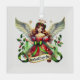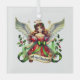 Este adorno de vidrio se muestra en un tamaño cuadrado con un Ángel festivo deseando una Feliz Navidad a través de una pancarta. multicolor rojo, blanco y verde. Personaliza con texto de nombre y fecha. Personalizar este elemento con esta plantilla o compre como se muestra.