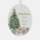 Mi primer adorno navideño adorno con nombre de recién nacido y fecha de nacimiento. El diseño incluye un árbol de navidad iluminado con cuna y regalos envueltos. Un regalo perfecto para un recién nacido.