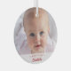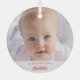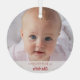 Un adorno de Mi Primer Navidad muy simple, con solo una foto de bebé y, en la parte inferior, sobre una zona transparente, las palabras "Mi primer Navidad" en letra manuscrita y debajo de ellas, el nombre en letras más grandes. Todo el texto es rojo