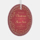 Primera Navidad en la calle<add name of your street>en una tipografía clásica y simple de escritura serif y cursiva sobre un fondo rojo con curvas falsas de oro ornamentadas.