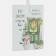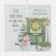 Primera Navidad en nuevo ornamento de vacaciones en casa - que puedes editar para solteros, parejas y familias y personalizar con el año y tu nueva dirección. Diseño de la puerta principal de los navidades festivos, decorado con guirnaldas y guirnaldas. La escena está decorada con acogedores elementos domésticos que incluyen linternas brillantes, árboles de navidad, muñecos de nieve y trineo.