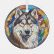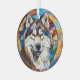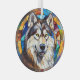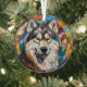 Aquí hay un adorno de cristal de bonito con una temática de vidrio manchado, con un hermoso perro de Malamute de Alaska. El perro se coloca sobre un fondo de mosaico multicolor. Los colores incluyen azul, oro, rojo marrón y más. Esto hace que sea un buen obsequio o decoración para la casa que ama un majestuoso Malamute.