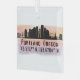 Glass ornament features Portland Oregon city skyline silhouette with watercolor splash and latitude & longitude map coordinates