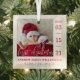 Anuncie y reciba la llegada de su recién nacido con nuestro sencillo y moderno anuncio de la foto del bebé, el primer ornamento de cristal de Navidad. El diseño incluye un diseño fotográfico único para mostrar la foto de tu recién nacido. "Primera Navidad" se muestra en una moderna caligrafía blanca con la fecha de nacimiento mostrada a lo largo del costado y el nombre del bebé y las estadísticas de nacimiento a lo largo del fondo.