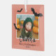 Primer ornamento de vidrio para pulseras negras de Halloween para bebé. El nombre de un bebé personalizado en un guión moderno y 3 murciélagos negros. Personalice el adorno con la foto, el nombre y el año de su bebé. Un lindo obsequio por las fiestas de Halloween.