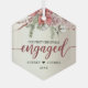 .Para su primera Navidad se ha dedicado este elegante y personalizado adorno vacacional para parejas con una acuarela pintada a mano, borde superior de la poinsettia roja y rosas malvas rosadas con bolas de algodón y vegetación. El texto de abajo dice en un guión verde cazador y borgoñoso "Nuestra primera Navidad comprometida" con tus primeros nombres unidos por un corazón y un año a personalizar. La parte trasera del adorno tiene una foto para que cambies a la tuya. ¡Buena suerte en tu futuro boda! Diseñado por Susan Coffey.
