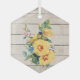 Podrá disfrutar de las flores amarillas soleadas en cualquier época del año con este adorable adorno de cristal. Este ramo de flores de estilo vintage se alza sobre un falso fondo rústico de madera, como si las flores estuvieran a lo largo de una valla o casa. Este adorno chic y desagradable puede alegrar tu árbol de Navidad o cualquier decoración.