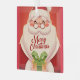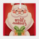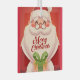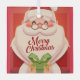 Ilustracion de Santa Claus sosteniendo un regalo con un arco verde, ambientado en un fondo rojo, con las palabras "Feliz Navidad" escritas en cursiva roja en su barba. El ilustracion está diseñado para parecerse a un adorno cuadrado de Navidad, con una cuerda blanca en la parte superior para colgar. El estilo recuerda a las tarjetas de vacaciones antiguas, con líneas depuradas y una paleta de colores limitada.