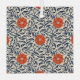 Seamless floral pattern with vibrant orange flowers and navy blue leaves on a beige background, creating an ornate, symmetrical design.