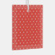 Seamless red background patterned with regularly spaced small white polka dots.