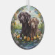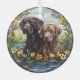 Two beautiful Labrador Retriever dogs, one black and one chocolate brown, are the feature on this pretty glass ornament. The dogs are pictured in a pond, with flowers and leaves surrounding them. This ornament makes a nice stocking stuffer at Christmas, but can be displayed all year long. I like to hang mine in a window that receives plenty of sunshine!