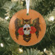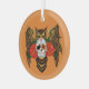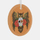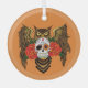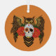 Un gran búho de cuerno pardo con un día de cráneo de azúcar muerto y rosas rojas en un telón de fondo naranja