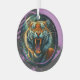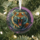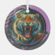 Una imagen feroz e intimidante con un tigre rugiendo con ojos claros y expresivos. La potente presencia del tigre se ve acentuada por las formas geométricas circundantes y los colores llamativos.