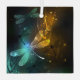 Vuelo de libélula resplandeciente, verde, dibujada de forma artística, con alas transparentes, verdes y amarillas sobre un brillante fondo nocturno con plantas de pantano y luciérnagas. Flauta de dragón resplandeciente.