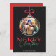 Estas caprichosas tarjetas de felicitación navideña de 5" x 7" presentan un adorno de árbol de fotos con un lazo rojo. La felicitación es "Feliz Navidad", en rojo y verde sobre un fondo negro con espacios para tu foto favorita, nombre(s) de la familia y año.