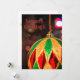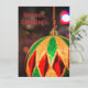 Una toma cercana muestra un adorno de Navidad con un patrón de diamante. El adorno está decorado con franjas alternas de purpurina verde y dorada, intercaladas con formas de diamante rojas. Cuelga de una cinta retorcida roja y verde. El fondo está desenfocado, mostrando luces bokeh en varios colores, lo que sugiere una atmósfera festiva.