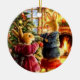 Pareja de conejitos adorables decorando su árbol de Navidad en su acogedora cabaña es la escena en este adorno navideño encantador.