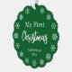 On the other side, inside the same circle of snowflakes, there is the text "My First Christmas" in big letters, with the word Christmas in script, and the name and the year under that in small caps. The background is forest green, the text is white.
