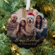 Modern Cute Minimalista Gold Script 2 Fotos Happy Holidays Script Holiday Ornament Card. Esta plantilla festiva, simple, minimalista, original de dos tarjetas de felicitación de festividad fotográfica presenta el texto de bienvenida de "Felices Fiestas", que está escrito en una foto de guión de caligrafía dorada con letras a mano, girando rápidamente y cruz. En la parte posterior con la plantilla de mensaje de bienvenida con un pequeño doodle cardíaco y una plantilla de foto. Tarjeta de saludo de bonito para su familia y amigos en temporada de vacaciones para Navidades.